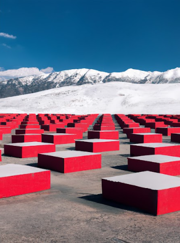 Description: "In Peace We Lie" presents a vast snowscaped mountain landscape with dozens of red rectangular pylons in a dead militarized fashion. Stoic, defined, impermeable yet breathable, these pylons stand as silent sentinels in the peaceful landscape, suggesting a hidden tension between nature and human intervention. Francisco Moctezuma Mejia's composition invites contemplation on the delicate balance between humanity's desire for order and the raw, untamed beauty of the natural world.