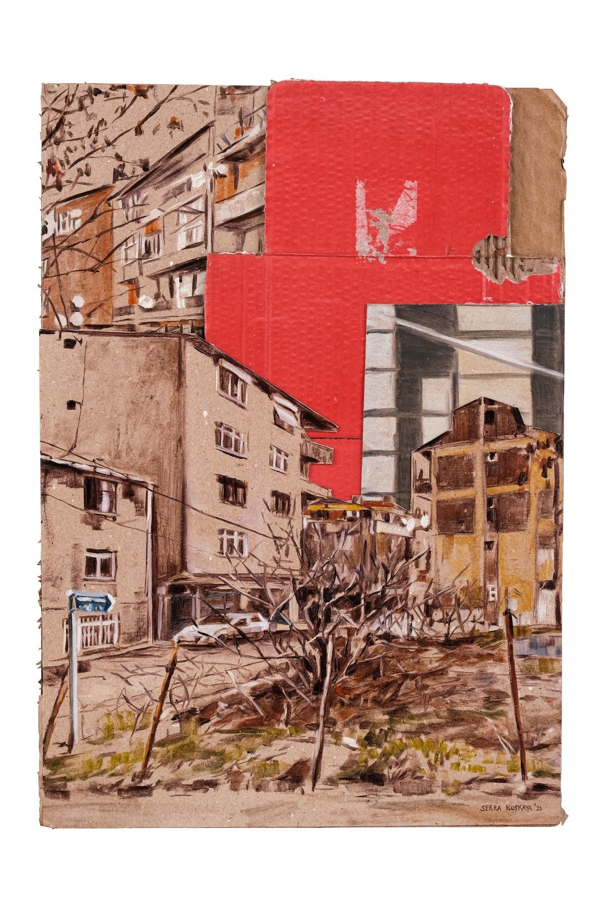 Serra Kuşkaya delves into the contradictions within her paintings, prompting reflection on our living practices through compositions crafted with the aesthetics of waste materials. In pondering the warning "Caution Fragile" on boxes safeguarding our most delicate possessions, she challenges us to consider whether we will persist in living recklessly or heed the caution."